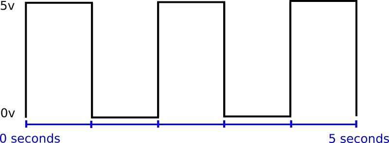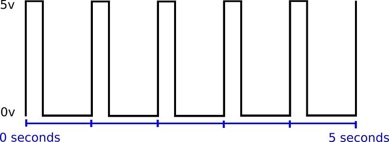 Notice that each HIGH and LOW pulse takes up an entire second each! This means that 1 "cycle" takes exactly 2 seconds - a cycle is one complete HIGH then LOW pulse. In this case, you would only see 1/2 of a cycle per second. The cycle speed is referred to as the "frequency" of the signal, because PWM signals generally maintain a constant frequency throughout their operation. Frequency in digital signals is measured in Hertz or Hz (which is the number of cycles per second) and the above signal would only be 0.5 Hz since it takes 2 seconds to complete 1 cycle. So what would a perfect 1 Hz signal look like?